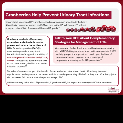 Learn more about the health benefits of refreshing cranberry juice, the role of cranberries in supporting urinary tract health, and the bioactive compounds that make this small berry so powerful. These resources make it simple to explore and communicate the many ways cranberries benefit the body with clients, consumers, and fellow HCPs.
